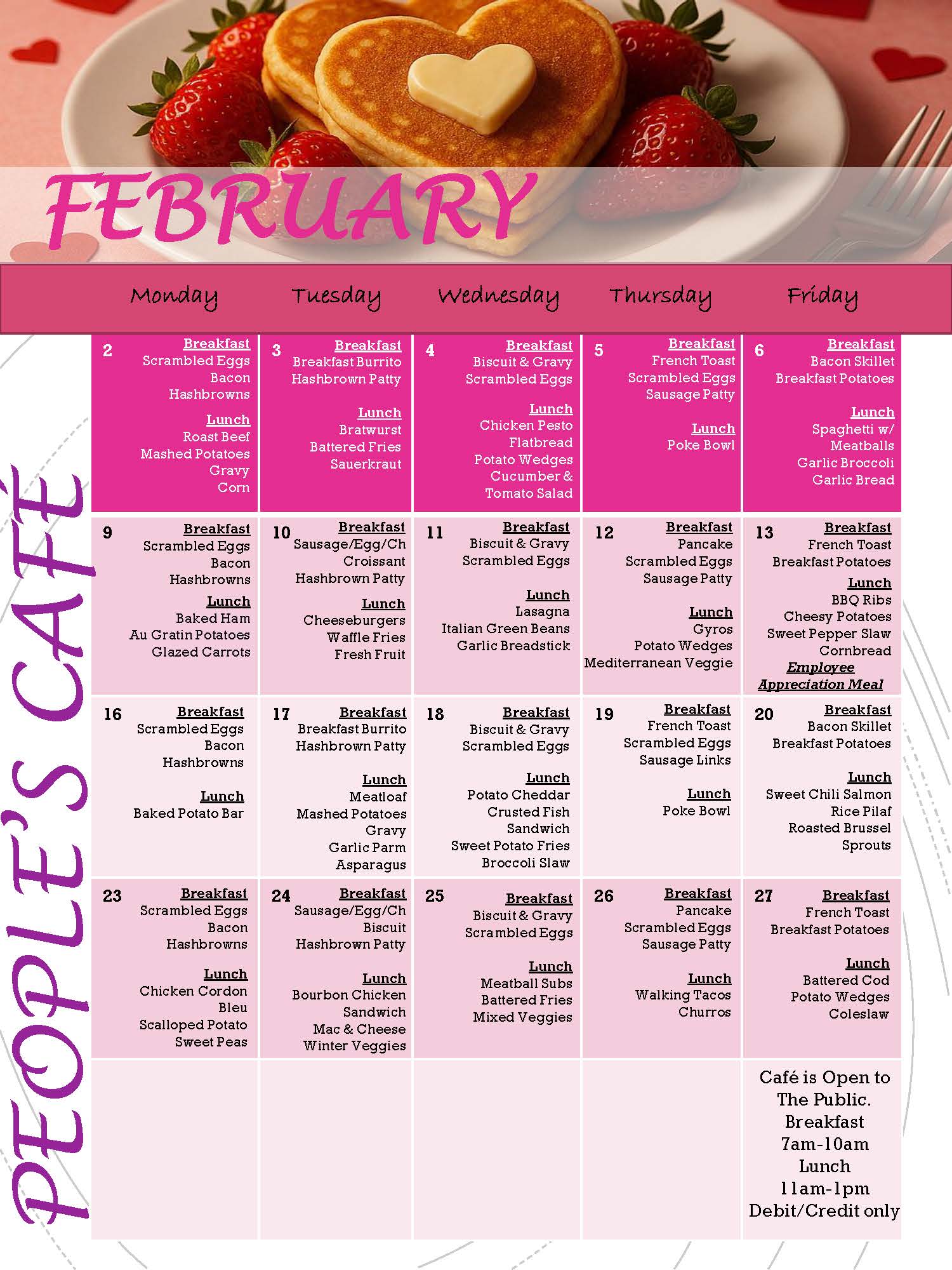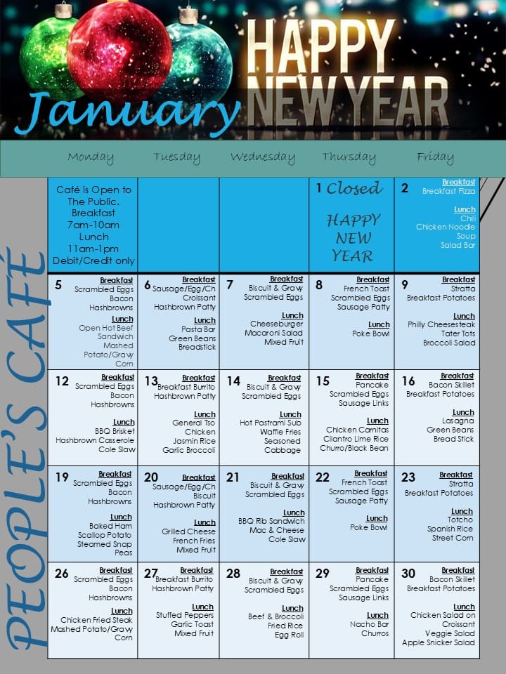People’s Café at BCHC is open to the public 24/7! Hot breakfast is served Monday–Friday from 7–10am, with lunch available 11am–1pm. Lunch offerings include a full salad bar, sandwich station, and hot meal options — all at a low cost. Premade items and snacks are available 24/7. Fountain beverages and coffee are always free!